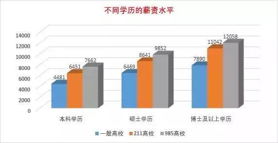同時985、211、普通高校的薪資也是有差距的。985高校起薪比211高校略高,平均差別為1000左右,而211和一般院校差別平均在2000左右。