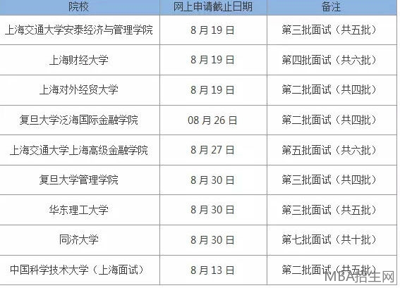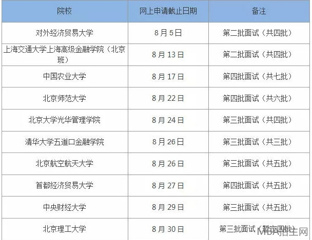 轉(zhuǎn)眼間2018年已經(jīng)已進(jìn)入到8月份,對(duì)于備考MBA的朋友們來說,留給你們的時(shí)間真的不多了,拿到提前批面試offer的,一定要制定計(jì)劃復(fù)習(xí)筆試了,而還在迷茫擇校的,不如再問問自己,為什么要考MBA?如果你想得明白,別多耽誤了,要抓緊申請(qǐng)面試了。8月份這些院校的面試又將截止一批: