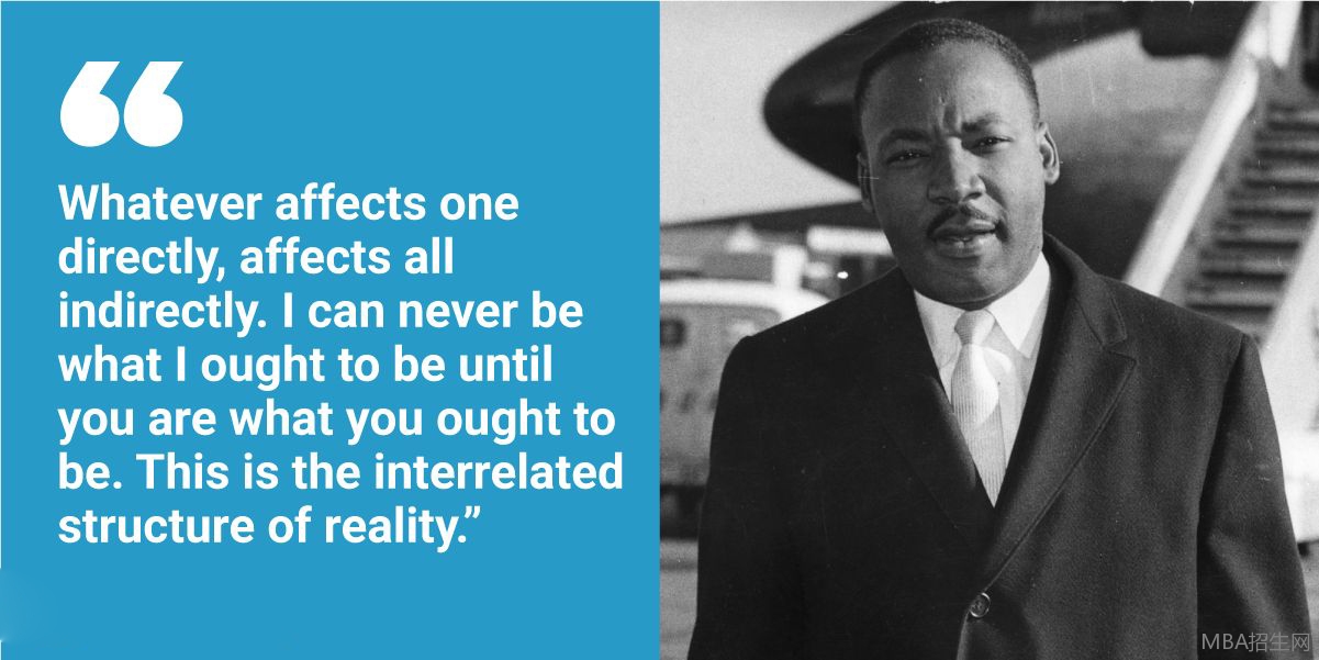 “任何直接影響一個人的,都會間接地影響所有人。我不可能成為我應該成為的人,除非你是你應該成為的人。這是現實的相互關聯的結構。”《伯明翰獄中的來信》馬丁·路德·金
