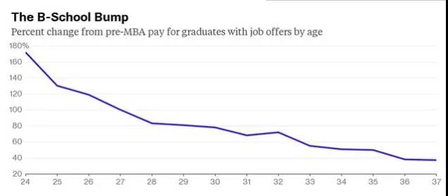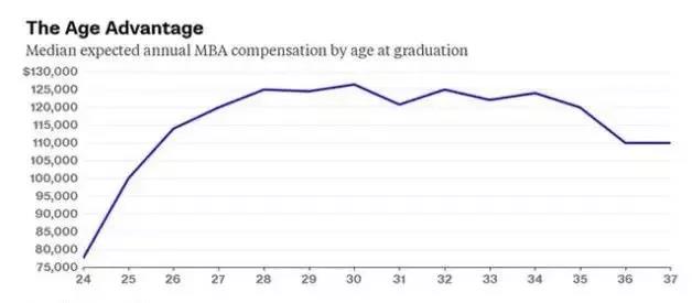 2014年調查了10000名全職MBA畢業生后發現,在30歲之前,得到MBA學位的年紀越大,薪水也就越高。這也能夠解釋的清楚:一個28歲的MBA畢業生比一個24歲的有更多經驗和教育。令人驚奇的是,30歲之后,經驗和教育帶來的優勢迅速下降。