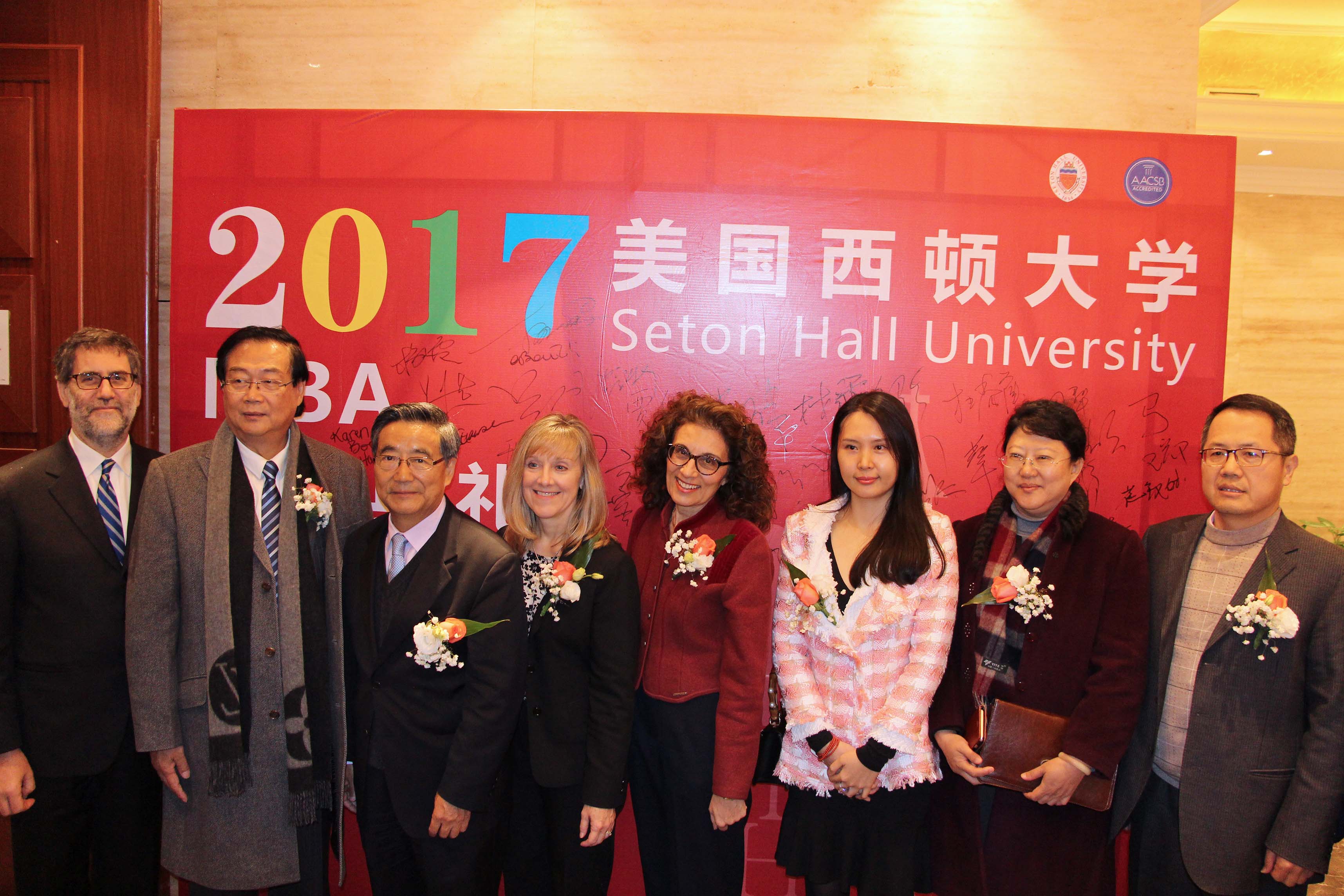 領導及學員代表發言完畢,舉行2017美國西頓大學(Seton Hall University)上海MBA學位班授班旗儀式,美國西頓大學(Seton Hall University)執行校長兼教務長Karen Boroff親手將班旗交到新班級的班長手中。