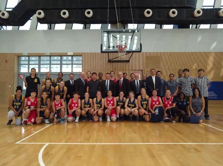 下午,天津財經(jīng)大學(xué)女籃隊與加拿大西三一大學(xué)女籃隊舉行了一場籃球友誼賽。比賽火熱激烈,球在場上飛快的穿梭,所有參賽隊員奮力拼搏,團結(jié)一致。現(xiàn)場觀眾打氣、喝彩,氣氛熱烈。最后天津財經(jīng)大學(xué)隊以微弱的比分,贏得了這場比賽。賽后球員紛紛合影留戀,展現(xiàn)了中加友誼的長存。