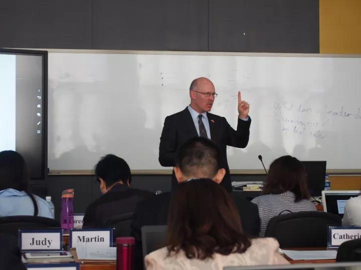 開學(xué)典禮期間,同學(xué)們也進行了第一次課程的學(xué)習。本次課程由加拿大西三一MBA項目主任Murray MacTavish教授為大家講授Leadership & Ethics。領(lǐng)導(dǎo)是一個影響他人和促進他們共同努力實現(xiàn)共同目標的過程。要做到這一點,領(lǐng)導(dǎo)者必須具備知識、技能、智慧和判斷力。本次課程Murray教授通過閱讀、案例研究、作業(yè)、小組討論和團隊建設(shè)活動,以及領(lǐng)導(dǎo)風格和技巧不同的自我評估、自我反省和來自他人的反饋,幫助學(xué)生發(fā)現(xiàn)自己的領(lǐng)導(dǎo)潛力和為學(xué)生成長奠定堅實的基礎(chǔ)。本次課程教學(xué)模式多元化,氣氛輕松又不失嚴謹,給同學(xué)們一個不一樣的教學(xué)體驗,受益匪淺,讓同學(xué)更加期待未來國際MBA的學(xué)習。