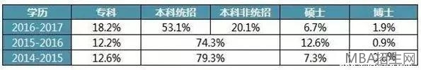 從學歷看,本科和碩士報考人數略有下降,專科和博士報考人數略有上升。雖然無學歷要求,但明顯的是學歷在不斷的走高。