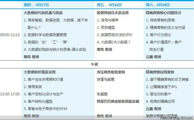 另外,我們還將邀請阿里巴巴商業(yè)智能部(BI)副總裁前來分享精確營銷的實(shí)踐案例,幫助學(xué)員理解以大數(shù)據(jù)和技術(shù)驅(qū)動的最新營銷策略和實(shí)用技術(shù)。