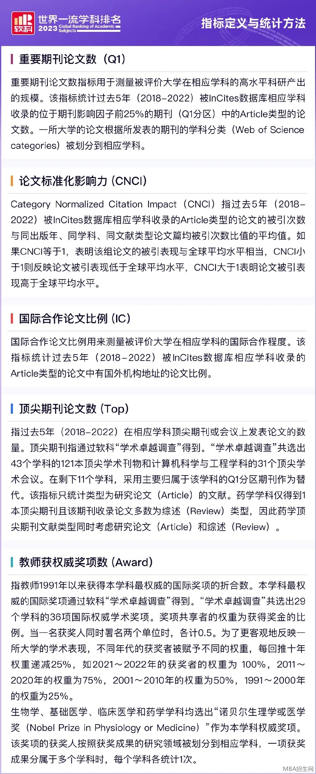 軟科《世界一流學科排名》使用一系列國際可比的客觀學術指標,按不同學科對世界各地高等教育機構進行衡量,具體指標包含: