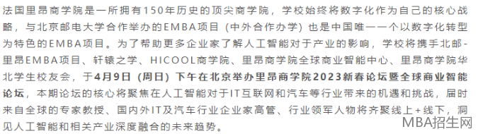 4月9日 法國里昂商學(xué)院2023新春論壇暨全球商業(yè)智能論壇:重構(gòu)-人工智能引領(lǐng)的產(chǎn)業(yè)變革 文  /MBA招生網(wǎng)2023-04-07 13:19:55