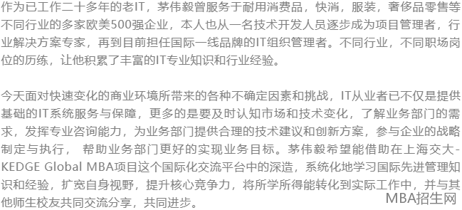 作為和上海交大素有淵源的一家全球領(lǐng)先的健康保險公司,安泰保險于1996年捐資1000萬美元冠名安泰管理學(xué)院。在安泰的12年里,張建生組建團隊成功建設(shè)并優(yōu)化公司核心技術(shù)系統(tǒng),完成國際業(yè)務(wù)系統(tǒng)架構(gòu)本地化,推動數(shù)字化創(chuàng)新轉(zhuǎn)型。作為安泰保險中國區(qū)IT負(fù)責(zé)人,張建生在IT戰(zhàn)略制定、核心技術(shù)系統(tǒng)建設(shè)優(yōu)化、信息安全體系建設(shè)等領(lǐng)域有豐富開發(fā)交付成功經(jīng)驗。張建生希望通過在上海交大-KEDGE Global MBA項目的進一步深造,能夠從全球化視角,專業(yè)系統(tǒng)化理解國際經(jīng)營管理框架,提升自己的核心能力,賦能行業(yè)數(shù)字化轉(zhuǎn)型創(chuàng)新,踐行企業(yè)及行業(yè)的責(zé)任和擔(dān)當(dāng)