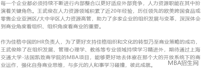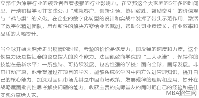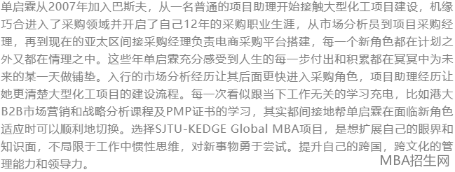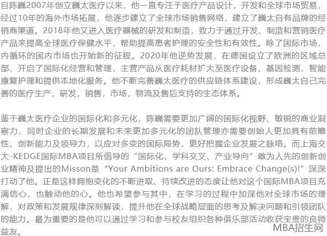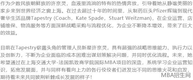 作為三家公司的投資人及總經(jīng)理,董彥汐具備獨到的商業(yè)嗅覺,具有開拓創(chuàng)新能力,善于挖掘各類創(chuàng)新業(yè)務(wù);同時她具有突出的溝通親和力和執(zhí)行力,在商業(yè)領(lǐng)域信譽度極好。通過本次上海交通大學(xué)-法國凱致商學(xué)院聯(lián)辦的Global MBA項目進修學(xué)習(xí),董彥汐希望可以全方位提高個人領(lǐng)導(dǎo)能力和商業(yè)管理能力,開拓商業(yè)嗅覺,在未來的商業(yè)創(chuàng)業(yè)和投資領(lǐng)域得到更好的發(fā)展。