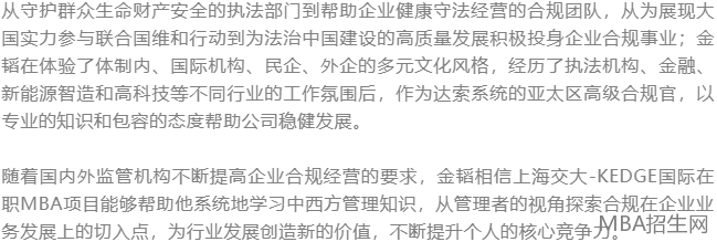 趙昕在貿(mào)易咨詢、生命醫(yī)療和電信行業(yè)的多家海外公司有超過15年的工作經(jīng)歷,擔(dān)任進出口物流和貿(mào)易合規(guī)等多個角色,具備豐富的海關(guān)事務(wù)和出口管制經(jīng)驗,深度參與和主導(dǎo)包括業(yè)務(wù)咨詢、流程設(shè)計、供應(yīng)商管理、關(guān)稅籌劃、合規(guī)計劃制定實施、審查和培訓(xùn)以及爭議解決等核心環(huán)節(jié)。方圓有道,合乎規(guī)矩;心存敬畏,行有所止一直是趙昕信奉的行為準(zhǔn)則和行事方式,時刻督促著他在當(dāng)今發(fā)展且充滿了機遇和挑戰(zhàn)的時代不斷夯實合規(guī)的基石,為公司的發(fā)展保駕護航。趙昕相信通過在上海交大-KEDGE Global MBA項目的深造,能夠進一步系統(tǒng)地熟悉現(xiàn)代先進管理知識,擴大國際視野和戰(zhàn)略思考能力,加強創(chuàng)新思維和前瞻性,進而提升自己解決問題的核心能力并收獲一起并肩前行的珍貴友情。