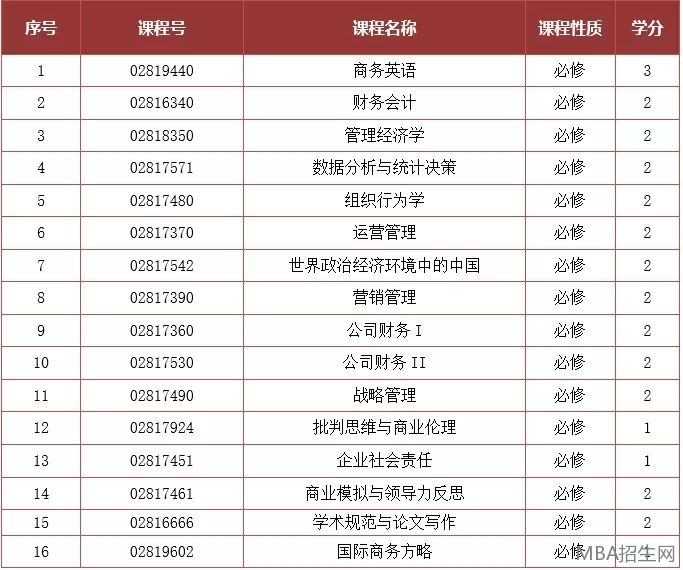 ? 開設課程:會計學、應用統計學、規劃與決策、管理經濟學、組織行為學、市場營銷、生產與作業管理、公司財務、戰略管理