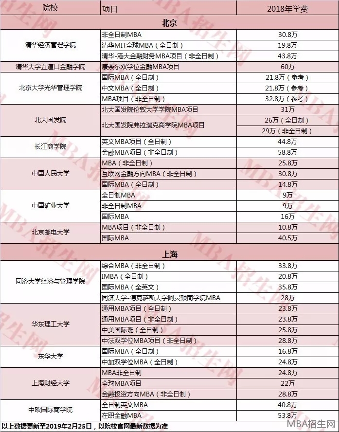 2019年各院校MBA最新學(xué)費(上海、北京)