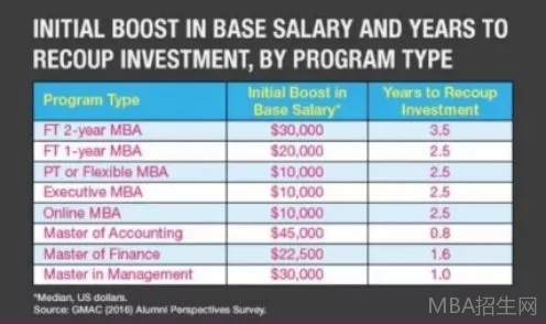 既然我們要用數(shù)字來談 MBA ,除了前期投入成本,當(dāng)然還有后期收獲的薪水,也就是 MBA 項目的回報情況。MBA學(xué)歷的價值在現(xiàn)如今大家有目共睹。它在金融、投行、企業(yè)咨詢等很多行業(yè)是重要的加分項,尤其是技術(shù)人員進入或鞏固管理職位的通行證。