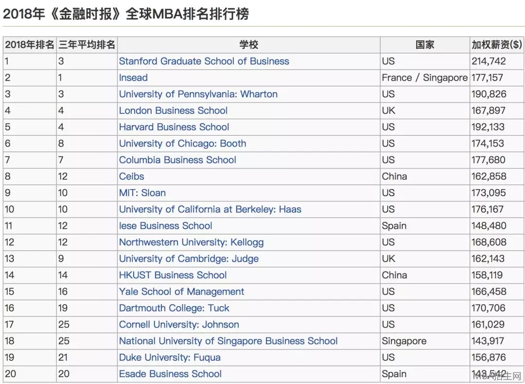 今年 1 月 28 日,也就是前不久,英國《金融時報》(Financial Times ,以下簡稱 FT)發(fā)布了 2018 年全球 MBA 項目排行榜。第一名被斯坦福大學(xué)商學(xué)院(Stanford Graduate School of Business)奪得;而歐洲工商管理學(xué)院(Insead)比去年降低一位,排名第二。值得一提的是,在排行榜前十中,有九個 MBA 項目是兩年制的,僅有排名第二的 Insead 是一年制的。