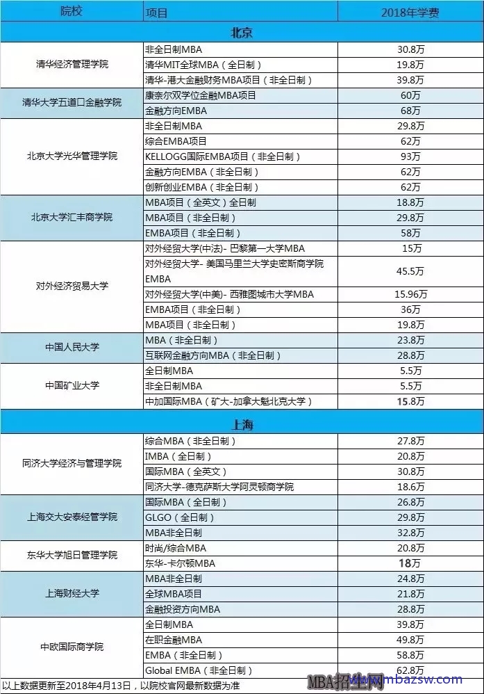 目前國內MBA學費的制定主要是高校自主定價,各校收費不同,主要受學校名氣、師資實力、市場環境等因素影響。在眾多商學院中,清華大學五道口金融學院、中歐國際工商學院的非全日制MBA三年學費為49.8萬~60萬不等,乃全國高校之“最”。